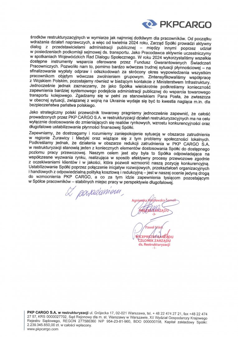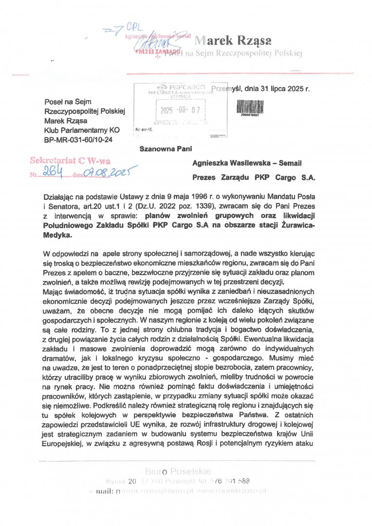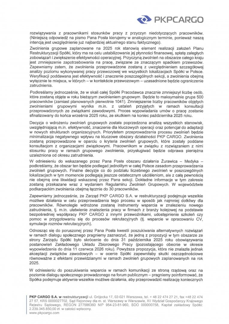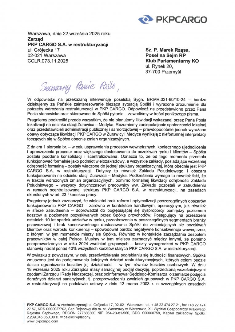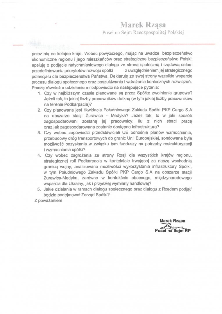 Interwencja w sprawie: planów zwolnień grupowych oraz likwidacji Południowego Zakładu Spółki PKP Cargo S.A na obszarze stacji Żurawica-Medyka