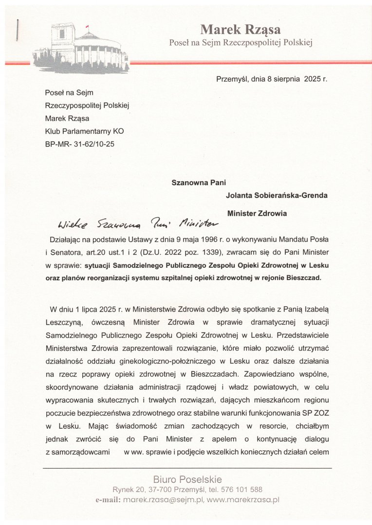 Interwencja w sprawie sytuacji Samodzielnego Publicznego Zespołu Opieki Zdrowotnej w Lesku oraz planów reorganizacji systemu szpitalnej opieki zdrowotnej w rejonie Bieszczad.