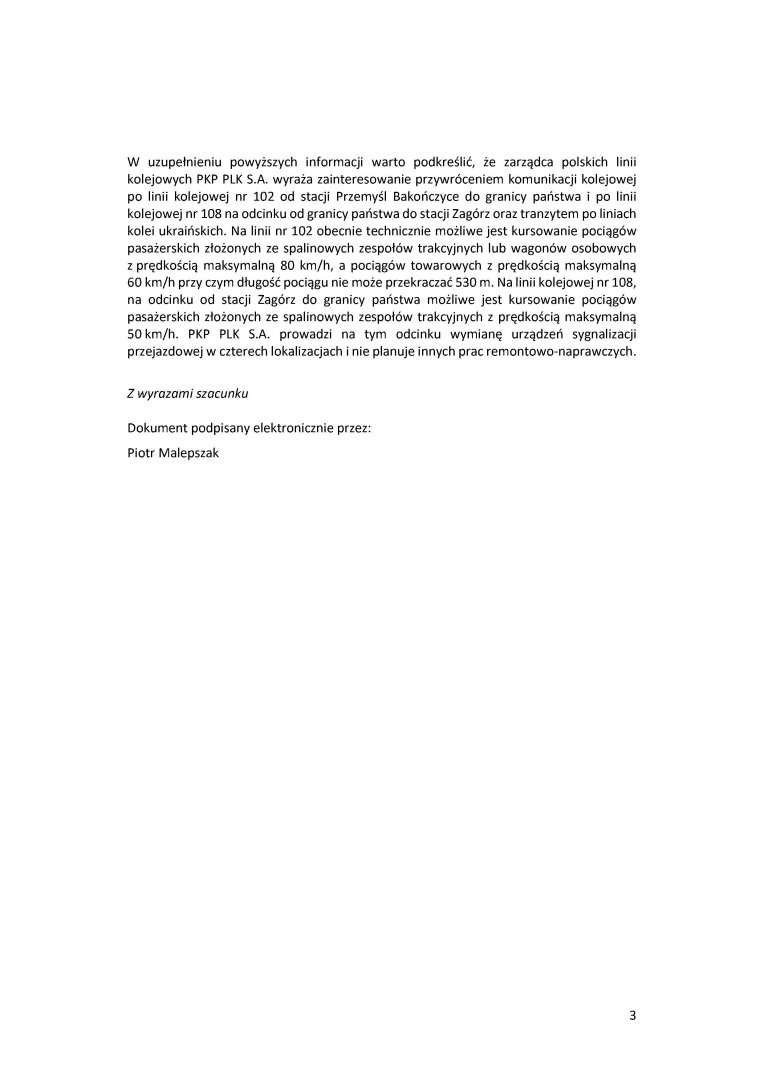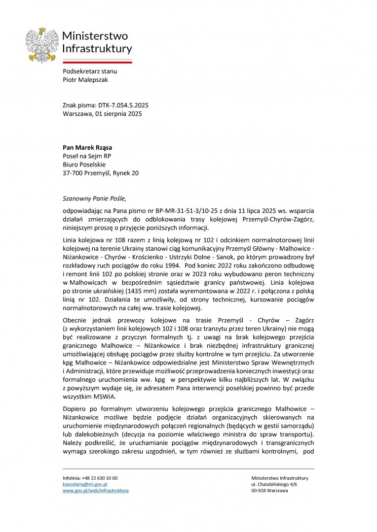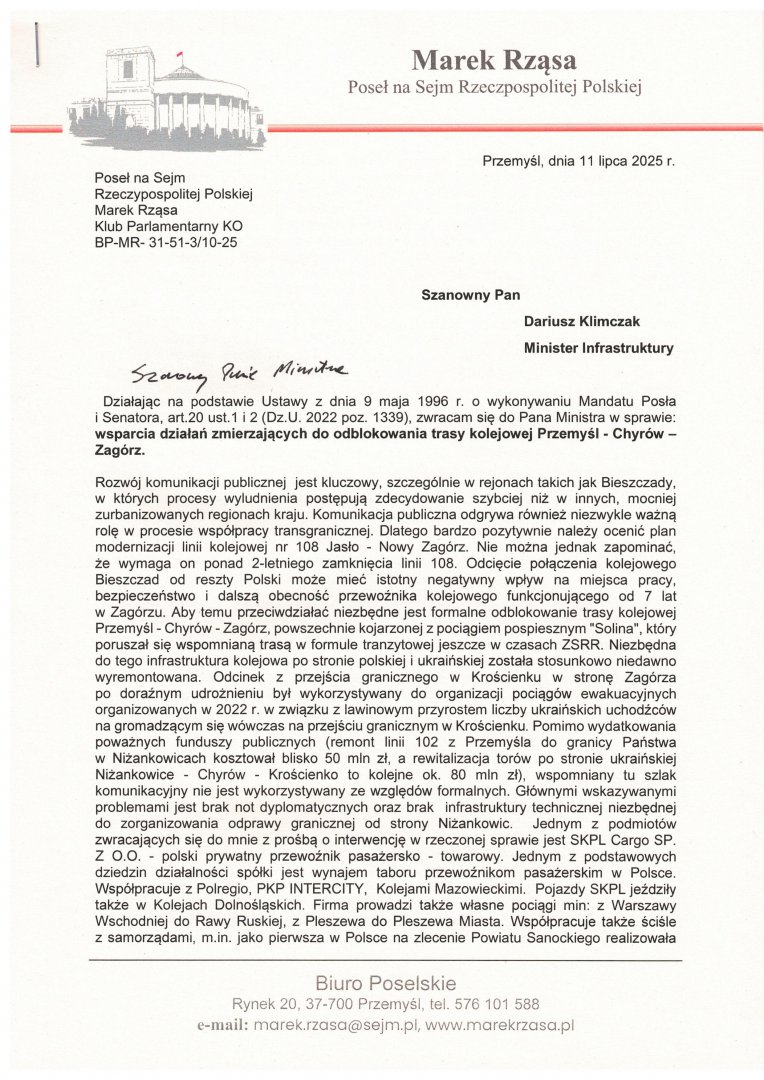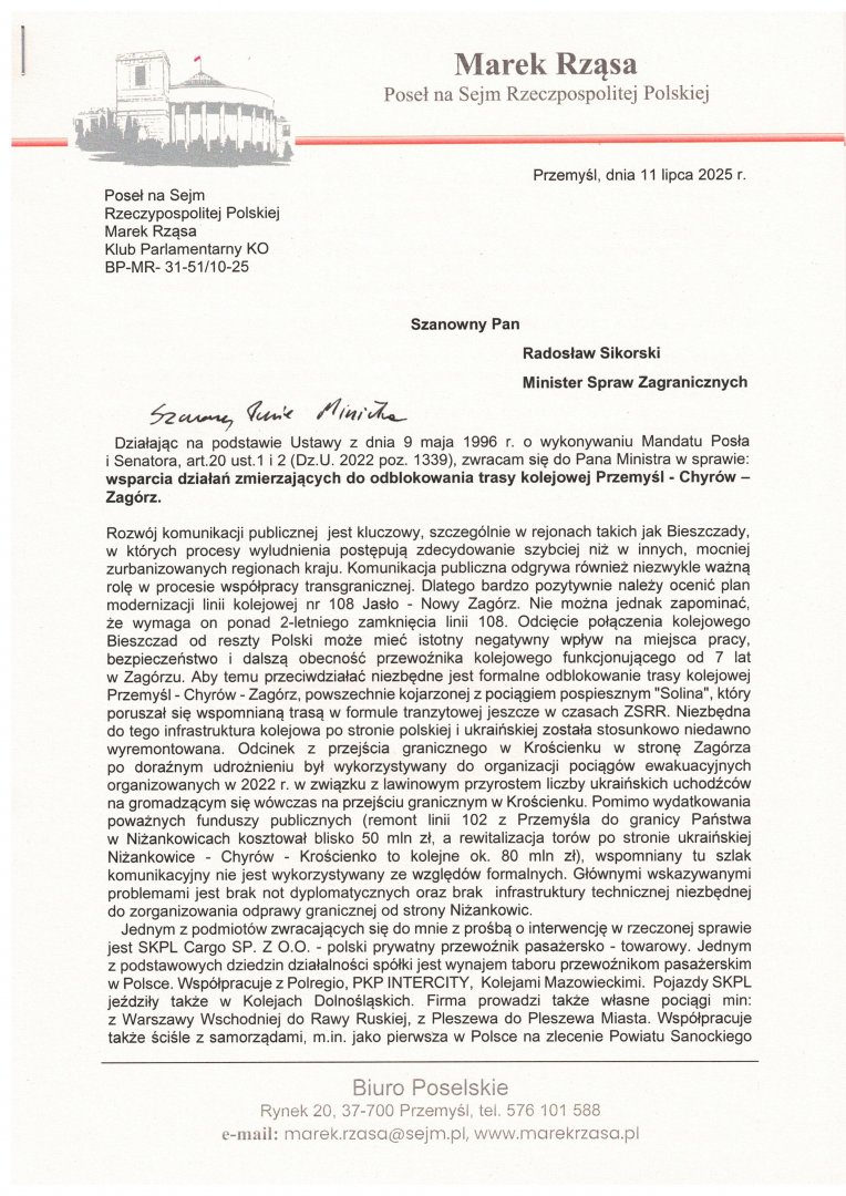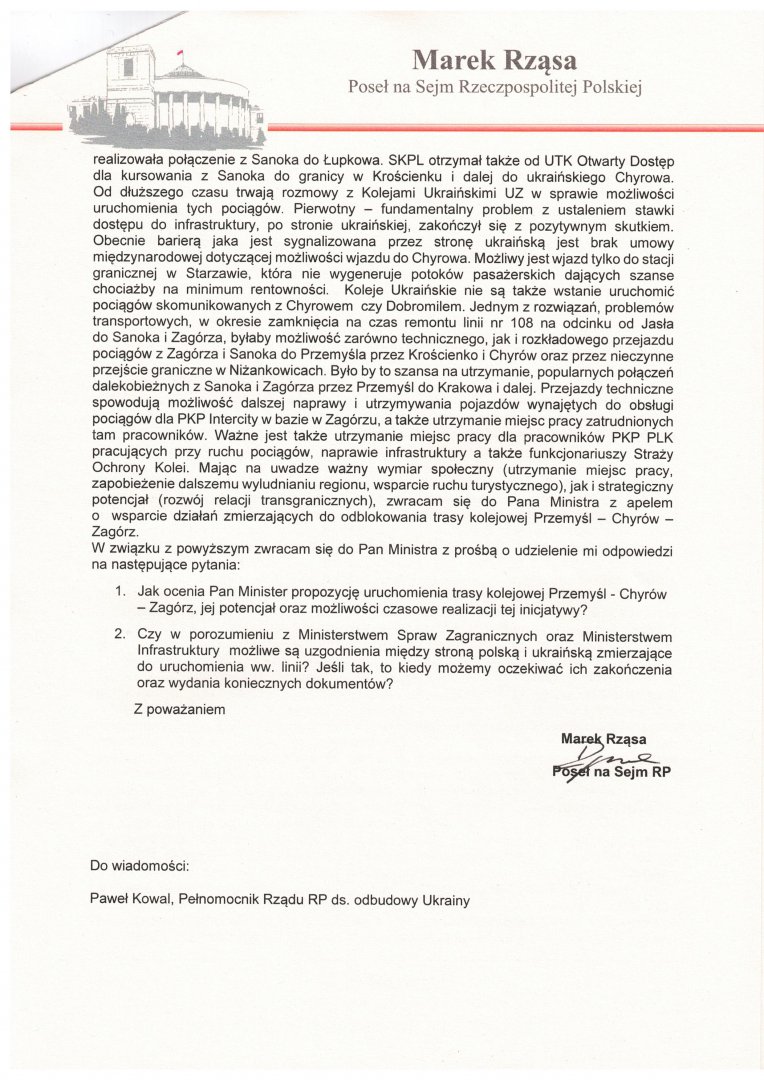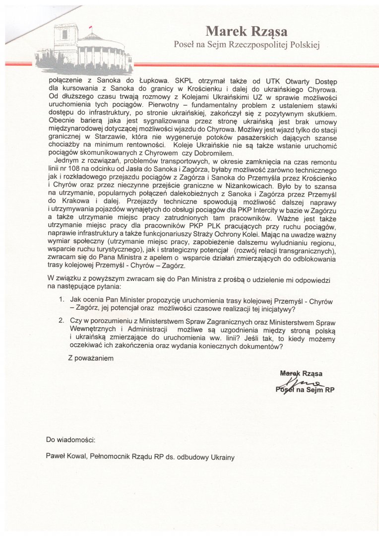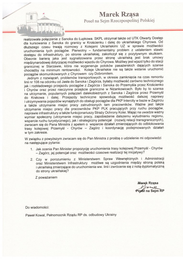 Interwencja w sprawie wsparcia działań zmierzających do odblokowania trasy kolejowej Przemyśl - Chyrów - Zagórz